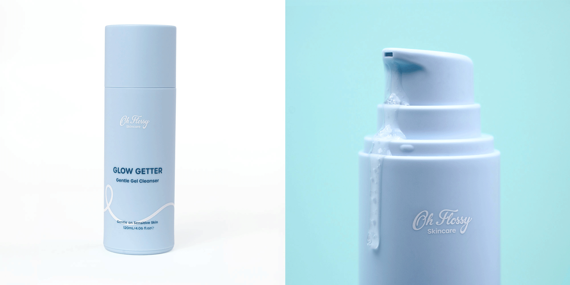 The Oh Flossy Skincare packaging was thoughtfully designed to be fun and to be feel luxe. The pump bottles were designed in 2 different colours with a sleek, matte finish. The boxes feature a holographic design, curvy lines and playful typography.